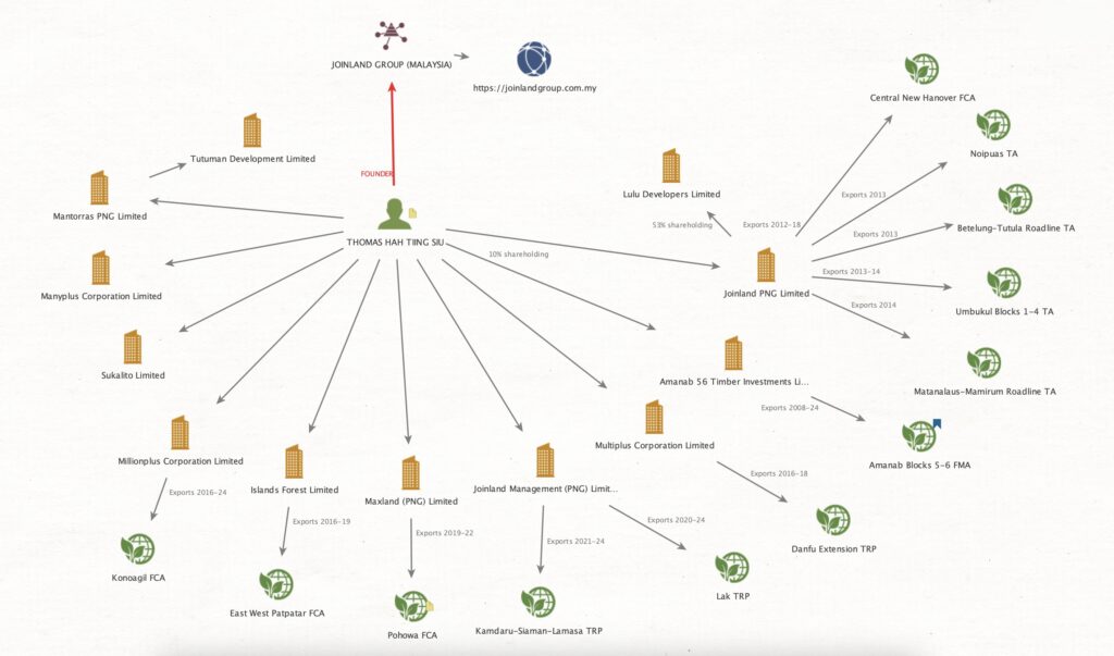 In the fifteen-year period from 2011, almost half of all logging operations (10 out of 22) on New Ireland have been controlled by companies connected to Hah Tiing Siu and the Joinland Group.