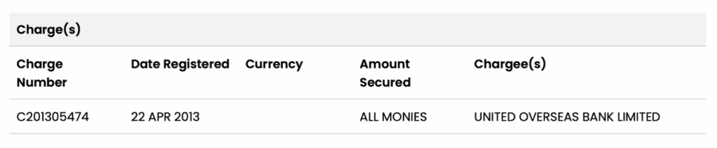 An excerpt from Multi Galaxy’s Corporate Profile showing United Overseas Bank Limited still holds a charge over the company’s assets